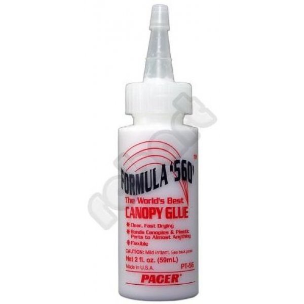 PART #: 547-56 Pacers FORMULA 560 GLUE offers exceptional bonding of most all plastic and vinyl. 560 dries clear making it the perfect glue to use for attaching airplane canopies and vacuum formed ABS parts. The excellent shock resistant flexible bond means your airplane parts will stay put even when subject to high vibration and extreme speeds. 560 is also an excellent craft glue. Its ability it stick various materials together makes it great for craft work including wood, clay, plaster, foam, and fabrics. The nontoxic and water based formula means kids can safely use it for their special projects.